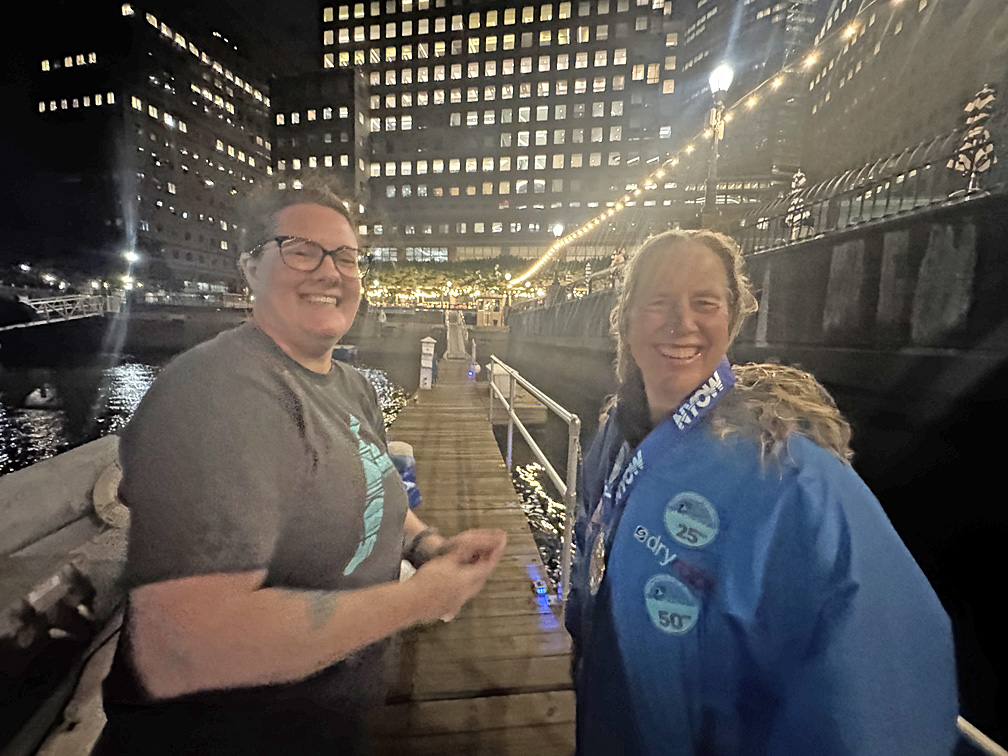 Linda Simons receives her finishers medal from the New York Open Water organization.