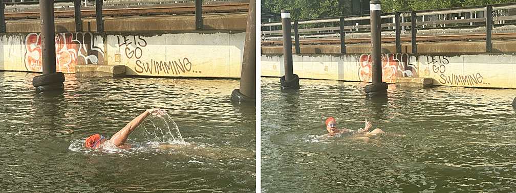 Linda Simons finishes the 28.5 Mile 20 Bridges Around Manhattan Island Swim in 8hrs. 43 mins. - July 20, 2025